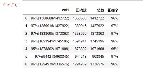 import pandas as pd d = {"col1" : ["96%(1368608/1412722)", "97%(1389916/1427922)", "97%(1338695/1373803)", "96%(1691941/1745196)", "95%(1878802/1971608)", "97%(944218/968845)", "96%(1294939/1336576)"]} df1 = pd.DataFrame(d) # load the digits from "(" to "/" df1['正确数'] = df1.iloc[:,0].apply(lambda x : x[x.index('(') + 1 : x.index('/')]) df1['总数'] = df1.iloc[:,0].apply(lambda x : x[x.index('/') + 1 : -1]) df1['正确率'] = df1.iloc[:,0].apply(lambda x : x[:x.index('(')]) df1 #cited from: https://blog.csdn.net/mochou111/article/details/95311065 |